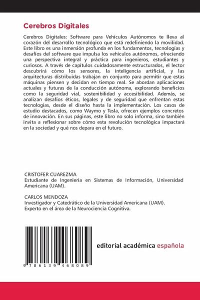 Cerebros Digitales: Software para Vehículos Autónomos te lleva al corazón del desarrollo tecnológico que está redefiniendo la movilidad. Este libro es una inmersión profunda en los fundamentos, tecnologías y desafíos del software que impulsa los vehículos autónomos, ofreciendo una perspectiva integral y práctica para ingenieros, estudiantes y curiosos. A través de capítulos cuidadosamente estructurados, el lector descubrirá cómo los sensores, la inteligencia artificial, y las arquitecturas distribuidas trabajan en conjunto para permitir que estas máquinas piensen y decidan en tiempo real. Se abordan aplicaciones actuales y futuras de la conducción autónoma, explorando beneficios como la seguridad vial, sostenibilidad y accesibilidad. Además, se analizan desafíos éticos, legales y de seguridad que enfrentan estas tecnologías, desde el diseño hasta la implementación. Los casos de estudio destacados, como Waymo y Tesla, ofrecen ejemplos concretos de innovación. En sus páginas, este libro no solo informa, sino también invita a reflexionar sobre cómo esta revolución tecnológica impactará en la sociedad y qué nos depara en el futuro.