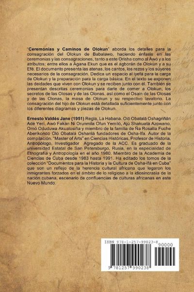 Este libro aborda los detalles para la consagración del Olokun de Babalawo, especificando en las ceremonias y las consagraciones, tanto a este Orisha como al Awó y a los atributos; entre ellos a Agana Ekun que es el agborán de Olokun y a su Efé. El documento presenta las atenas, los cantos, los rezos y los súyeres necesarios de la consagración. Dedica un espacio al iyefá para la carga de Olokun y la preparación para la carga básica. En el texto se exponen las deidades que viven con Olokun y se reciben junto con él. También se presentan descritas ceremonias para darle de comer a Olokun, los secretos de las Olosas y de las Olonas, así como el Osain de las Olosas y de las Olonas, la masa de Olokun y su respectivo lavatorio. La consagración del hijo de Olokun está detallada suficientemente junto con los diferentes diagramas y piezas de Olokun. En Anexos Las Reglas, Los Códigos Éticos y los Refranes de Osha-Ifá.
