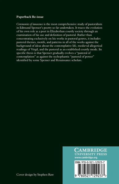 Ceremonies of Innocence, originally published in 1989, was the most comprehensive study of pastoralism in Edmund Spenser's poetry undertaken. The book traces the evolution of Spenser's own role as a poet in Elizabethan courtly society through an examination of his use and definition of pastoral. Rather than concentrating exclusively on his works in pastoral genres, it includes pastoral themes, motifs, and patterns in all of the works against the background of ideas about the contemplative life, medieval allegorical readings of Virgil, and the pastoral as an established courtly mode. It specific thesis is that Spenser gradually evolves a 'pastoral of contemplation' as against the sychophantic 'pastoral of power' identified by some Spenser and Renaissance scholars.
