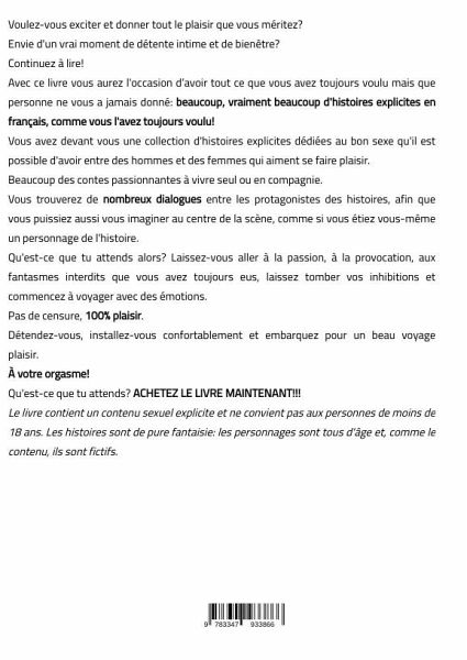 Voulez-vous exciter et donner tout le plaisir que vous méritez?Envie d'un vrai moment de détente intime et de bienêtre?Continuez à lire!Avec ce livre vous aurez l'occasion d'avoir tout ce que vous avez toujours voulu mais que personne ne vous a jamais donné: beaucoup, vraiment beaucoup d'histoires explicites en français, comme vous l'avez toujours voulu!Vous avez devant vous une collection d'histoires explicites dédiées au bon sexe qu'il est possible d'avoir entre des hommes et des femmes qui aiment se faire plaisir. Beaucoup des contes passionnantes à vivre seul ou en compagnie.Vous trouverez de nombreux dialogues entre les protagonistes des histoires, afin que vous puissiez aussi vous imaginer au centre de la scène, comme si vous étiez vous-même un personnage de l'histoire.Qu'est-ce que tu attends alors? Laissez-vous aller à la passion, à la provocation, aux fantasmes interdits que vous avez toujours eus, laissez tomber vos inhibitions et commencez à voyager avec des émotions.Pas de censure, 100 pour 100 de plaisir.Détendez-vous, installez-vous confortablement et embarquez pour un beau voyage plaisir.À votre orgasme!