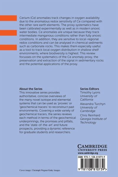 Ce anomalies track changes in oxygen availability due to the anomalous redox-sensitivity of Ce compared with the other rare earth elements. This review focusses on the systematics of the Ce anomaly proxy, the preservation and extraction of the signal in sedimentary rocks, and the potential applications of the proxy.