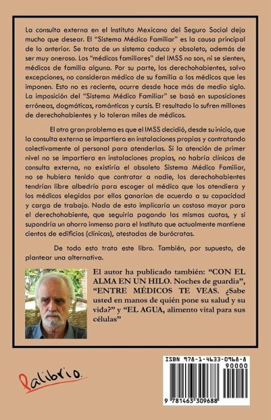 La consulta externa en el Instituto Mexicano del Seguro Social deja mucho que desear. El "Sistema Médico Familiar" es la causa principal de lo anterior. Se trata de un sistema caduco y obsoleto, además de ser muy oneroso. Los "médicos familiares" del IMSS no son, ni se sienten, médicos de familia alguna. Por su parte, los derechohabientes, salvo excepciones, no consideran médico de su familia a los médicos que les imponen. Esto no es reciente, ocurre desde hace más de medio siglo. La imposición del "Sistema Médico Familiar" se basó en suposiciones erróneas, dogmáticas, románticas y cursis. El resultado lo sufren millones de derechohabientes y lo toleran miles de médicos. El otro gran problema es que el IMSS decidió, desde su inicio, que la consulta externa se impartiera en instalaciones propias y contratando colectivamente al personal para atenderlas. Si la atención de primer nivel no se impartiera en instalaciones propias, no habría clínicas de consulta externa, no existiría el obsoleto Sistema Médico Familiar, no se hubiera tenido que contratar a nadie, los derechohabientes tendrían libre albedrío para escoger al médico que los atendiera y los médicos elegidos por ellos ganarían de acuerdo a su capacidad y carga de trabajo. Nada de esto implicaría un costoso mayor para el derechohabiente, que seguiría pagando las mismas cuotas, y sí supondría un ahorro inmenso para el Instituto que actualmente mantiene cientos de edificios (clínicas), atestadas de burócratas. De todo esto trata este libro. También, por supuesto, de plantear una alternativa.