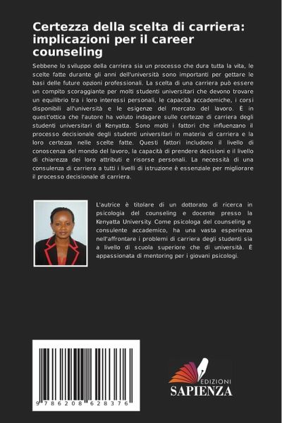 Sebbene lo sviluppo della carriera sia un processo che dura tutta la vita, le scelte fatte durante gli anni dell'università sono importanti per gettare le basi delle future opzioni professionali. La scelta di una carriera può essere un compito scoraggiante per molti studenti universitari che devono trovare un equilibrio tra i loro interessi personali, le capacità accademiche, i corsi disponibili all'università e le esigenze del mercato del lavoro. È in quest'ottica che l'autore ha voluto indagare sulle certezze di carriera degli studenti universitari di Kenyatta. Sono molti i fattori che influenzano il processo decisionale degli studenti universitari in materia di carriera e la loro certezza nelle scelte fatte. Questi fattori includono il livello di conoscenza del mondo del lavoro, la capacità di prendere decisioni e il livello di chiarezza dei loro attributi e risorse personali. La necessità di una consulenza di carriera a tutti i livelli di istruzione è essenziale per migliorare il processo decisionale di carriera.