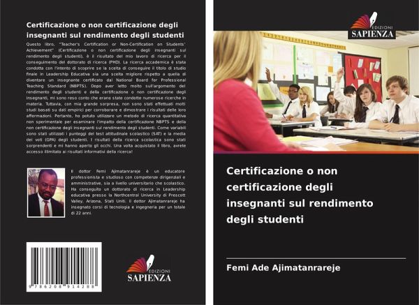 Questo libro, "Teacher's Certification or Non-Certification on Students' Achievement" (Certificazione o non certificazione degli insegnanti sul rendimento degli studenti), è il risultato del mio lavoro di ricerca per il conseguimento del dottorato di ricerca (PHD). La ricerca accademica è stata condotta con l'intento di scoprire se la scelta di conseguire il titolo di studio finale in Leadership Educativa sia una scelta migliore rispetto a quella di diventare un insegnante certificato dal National Board for Professional Teaching Standard (NBPTS). Dopo aver letto molto sull'argomento del rendimento degli studenti e della certificazione o non certificazione degli insegnanti, mi sono reso conto che erano state condotte numerose ricerche in materia. Tuttavia, con mia grande sorpresa, non sono stati effettuati molti studi basati su dati empirici per corroborare e dimostrare i risultati delle loro affermazioni. Pertanto, ho potuto utilizzare un metodo di ricerca quantitativa non sperimentale per esaminare l'impatto della certificazione NBPTS e della non certificazione degli insegnanti sul rendimento degli studenti. Come variabili sono stati utilizzati i punteggi del test attitudinale scolastico (SAT) e la media dei voti (GPA) degli studenti. I risultati della ricerca scolastica sono stati sorprendenti e mi hanno aperto gli occhi. Una volta acquistato il libro, avrete accesso illimitato ai risultati informativi della ricerca!