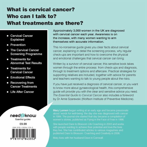 Awareness of cervical cancer has grown in recent years and many women are looking to find out more. It is estimated that 3,000 women in the UK are diagnosed with the cancer each year. This book aims to help women of all ages find out more about testing for cervical cancer, understanding how important it is to go for regular check-ups and overcoming the physical and emotional challenges cervical cancer can bring. Written in a sensitive, straightforward manner, the book guides women through the entire process from check-ups to diagnosis, treatment and aftercare. There is also an extensive list of sources of help and support. If you're supporting a partner, daughter or friend through cervical cancer, or just want to know more about gynaecological health and check-ups, this guide will provide you with the sound, sensitive advice you need.