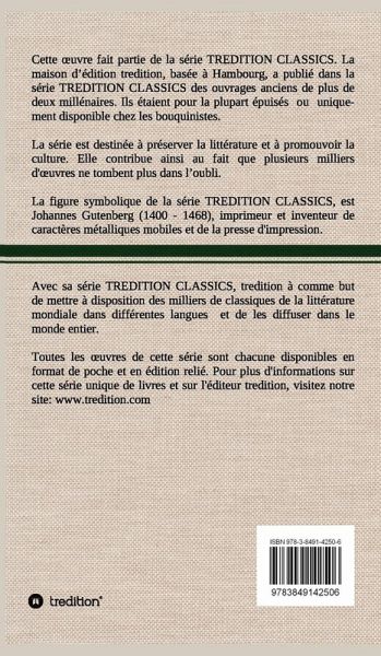 Cette uvre (édition relié) fait partie de la série TREDITION CLASSICS. La maison d édition tredition, basée à Hambourg, a publié dans la série TREDITION CLASSICS des ouvrages anciens de plus de deux millénaires. Ils étaient pour la plupart épuisés ou uniquement disponible chez les bouquinistes. La série est destinée à préserver la littérature et à promouvoir la culture. Avec sa série TREDITION CLASSICS, tredition à comme but de mettre à disposition des milliers de classiques de la littérature mondiale dans différentes langues et de les diffuser dans le monde entier.