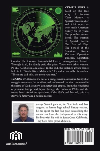 CESAR'S WARS is based on the true story of Roberto César Montiel, a Special Forces soldier and CIA operative who made American history for 35 years: The portable atomic bomb. The creation of Special Forces. The Bay of Pigs. The School of the Americas. Korea. Vietnam. Operation Phoenix. Operation Condor. The Contras. Non-official Cover. Interrogations. Torture. Through it all, his family paid the price. There were other women. PTSD. Alcoholism and abuse. In the end, the violence always comes full circle. "You're like a Mafia wife," his oldest son tells his mother. "The more dad kills, the more you pray." CESAR'S WARS is also the tale of a first generation American family that struggles to endure the sacrifices and understand the sins committed in the name of God, country, democracy and empire. From the rebuilding of post-war Europe and Japan, through the turbulent 1960s, and the covert South American operations of the 1980s and beyond, this is a story of a family and a nation in crisis. CESAR'S WARS: The Rise of America's Special Forces is the first book in a four-part series. The story is told mainly from the first-person, no-nonsense point of view of Roberto, a complex and principled patriot. But he does not always have the last word. The voice of his wife, Faith, who struggles through wars and personal tragedy to hold the family together, and his oldest son, Roberto César Jr., who questions everything that his father stands for, are also presented. Based on over two hundred hours of taped interviews, their stories vividly illuminate the cloaked, forward guard operations that marked the Cold War, as well as the endless interpersonal repercussions - between husband and wife, father and son, and brother and brother - that are the personal cost of war.