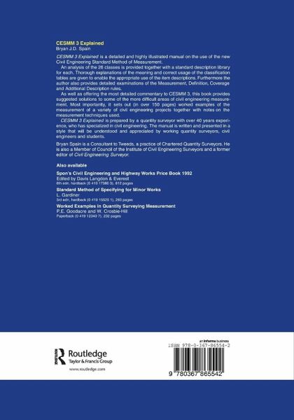 Preface. Introduction. Part 1: General. General principles of measurement. CESMM 3: How it works. Part 2: Classification tables. Class A: General terms. Class B: Ground investigation. Class C: Geotechnical and other specialist processes. Class D: Demolition and site clearance. Class E: Earthworks. Class F: In situ concrete. Class G: Concrete ancillaries. Class H: Precast concrete. Class I: Pipework - pipes. Class J: Pipework - fittings and valves. Class K: Pipework - manholes and pipework ancillaries. Class L: Pipework - supports and protection, ancillaries to laying and excavation. Class M: Structural metal work. Class N: Miscellaneous metal work. Class O: Timber. Class P: Piles. Class Q: Piling ancillaries. Class R: Roads and pavings. Class S: Rail track. Class T: Tunnels. Class U: Brickwork, blockwork and masonry. Class V: Painting. Class W: Waterproofing. Class X: Miscellaneous work. Class Y: Sewer and water main renovation and ancillary works. Class Z: Simple building works incidental to civil engineering works. Part 3: Appendices. Worked example - pumping station 1. Worked example - pumping station 2. Worked example - retaining wall. Worked example - road. Worked example - reinforcement. Worked example - small building. Mensuration and useful data. Index.