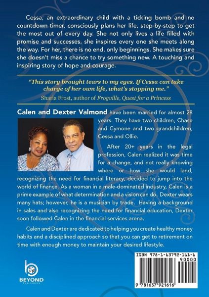 Cessa, an extraordinary child with a ticking bomb and no countdown timer, consciously plans her life, step-by-step to get the most out of every day. She not only lives a life filled with promise and successes, she inspires every one she meets along the way. For her, there is no end, only beginnings. She makes sure she doesn't miss a chance to try something new. A touching and inspiring story of hope and courage. This story brought tears to my eyes. If Cessa can take charge of her own life, what's stopping me." Sharla Frost, author of Frogville, Quest for a Princess Calen and Dexter Valmond have been married for almost 28 years. They have two children, Chase and Cymone and two grandchildren, Cessa and Ollie.After 20+ years in the legal profession, Calen realized it was time for a change, and not really knowing where or how she would land, recognizing the need for financial literacy, decided to jump into the world of finance. As a woman in a male-dominated industry, Calen is a prime example of what determination and a vision can do. Dexter wears many hats; however, he is a musician by trade. Having a background in sales and also recognizing the need for financial education, Dexter soon followed Calen in the financial services arena.Calen and Dexter are dedicated to helping you create healthy money habits and a disciplined approach so that you can get to retirement on time with enough money to maintain your desired lifestyle.