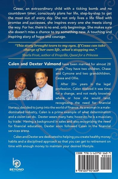 Cessa, an extraordinary child with a ticking bomb and no countdown timer, consciously plans her life, step-by-step to get the most out of every day. She not only lives a life filled with promise and successes, she inspires every one she meets along the way. For her, there is no end, only beginnings. She makes sure she doesn't miss a chance to try something new. A touching and inspiring story of hope and courage. This story brought tears to my eyes. If Cessa can take charge of her own life, what's stopping me." Sharla Frost, author of Frogville, Quest for a Princess Calen and Dexter Valmond have been married for almost 28 years. They have two children, Chase and Cymone and two grandchildren, Cessa and Ollie.After 20+ years in the legal profession, Calen realized it was time for a change, and not really knowing where or how she would land, recognizing the need for financial literacy, decided to jump into the world of finance. As a woman in a male-dominated industry, Calen is a prime example of what determination and a vision can do. Dexter wears many hats; however, he is a musician by trade. Having a background in sales and also recognizing the need for financial education, Dexter soon followed Calen in the financial services arena.Calen and Dexter are dedicated to helping you create healthy money habits and a disciplined approach so that you can get to retirement on time with enough money to maintain your desired lifestyle.