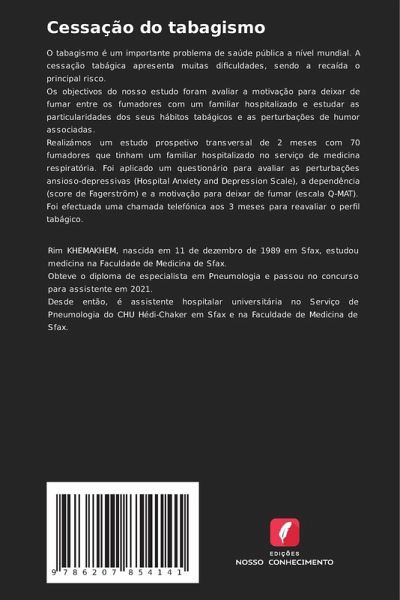 O tabagismo é um importante problema de saúde pública a nível mundial. A cessação tabágica apresenta muitas dificuldades, sendo a recaída o principal risco.Os objectivos do nosso estudo foram avaliar a motivação para deixar de fumar entre os fumadores com um familiar hospitalizado e estudar as particularidades dos seus hábitos tabágicos e as perturbações de humor associadas.Realizámos um estudo prospetivo transversal de 2 meses com 70 fumadores que tinham um familiar hospitalizado no serviço de medicina respiratória. Foi aplicado um questionário para avaliar as perturbações ansioso-depressivas (Hospital Anxiety and Depression Scale), a dependência (score de Fagerström) e a motivação para deixar de fumar (escala Q-MAT). Foi efectuada uma chamada telefónica aos 3 meses para reavaliar o perfil tabágico.