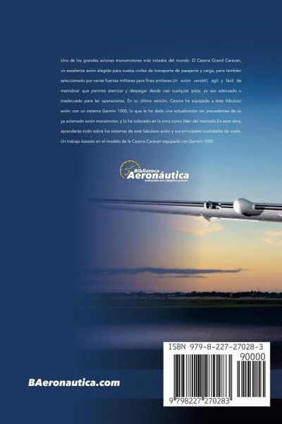 One of the most widely flown large single-engine aircraft in the world. The Cessna Grand Single-Engine, an excellent aircraft chosen for civilian passenger and cargo transportation flights, but also selected by various military forces for similar purposes. A versatile, agile, and easy-to-maneuver aircraft that allows landing and takeoff from almost any runway, whether suitable or unsuitable for operations. In its latest version, Cessna has equipped this fabulous aircraft with a Garmin 1000 system, giving it an unparalleled upgrade to its already acclaimed single-engine airplane and placing it at the top as the market leader. In this work, you will learn everything about the systems of this fabulous aircraft and its main flight qualities. A work based on the model of the Cessna Caravan equipped with Garmin 1000.
