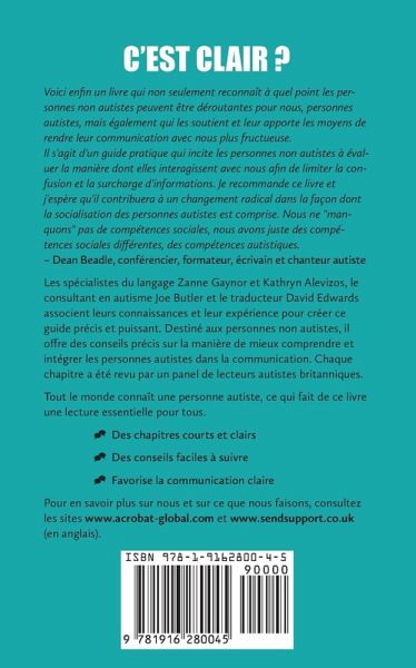 Voici un livre qui non seulement reconnaît à quel point les personnes non autistes peuvent être déroutantes pour nous, personnes autistes, mais également qui les soutient et leur apporte les moyens de rendre leur communication avec nous plus fructueuse. Il s'agit d'un guide pratique qui incite les personnes non autistes à évaluer la manière dont elles interagissent avec nous afin de limiter la confusion et la surcharge d'informations. Destiné aux personnes non autistes, 'C'est clair?' offre des conseils précis sur la manière de mieux comprendre et intégrer les personnes autistes dans la communication. Chaque chapitre a été revu par un panel de lecteurs autistes britanniques.