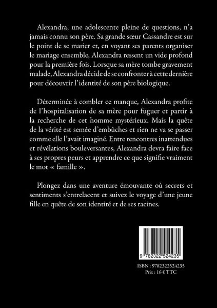 Alexandra, une adolescente pleine de questions, n'a jamais connu son père. Sa grande soeur Cassandre est sur le point de se marier, et en voyant ses parents organiser le mariage ensemble, Alexandra ressent un vide profond pour la première fois. Lorsque sa mère tombe gravement malade, Alexandra décide de se confronter à cette dernière pour découvrir l'identité de son père biologique.Déterminée à combler ce manque, Alexandra profite de l'hospitalisation de sa mère pour fuguer et partir à la recherche de cet homme mystérieux. Mais la quête de la vérité est semée d'embûches, et rien ne se passera comme elle l'avait imaginé. Entre rencontres inattendues et révélations bouleversantes, Alexandra devra faire face à ses propres peurs et apprendre ce que signifie vraiment le mot "famille".Plongez dans une aventure émouvante où secrets et sentiments s'entrelacent, et suivez le voyage d'une jeune fille en quête de son identité et de ses racines.
