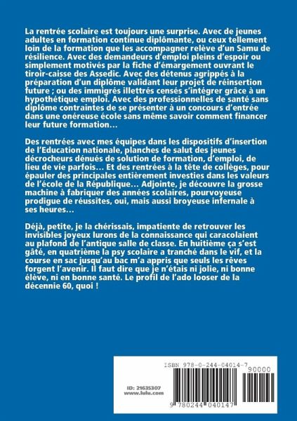Mai 68 en province...rien à voir avec les joyeux et combatifs trublions parisiens ! La baby-boomer ado vit les radicalisés locaux tenter de détourner la vague féconde au profit de leurs -trop- sérieux desseins. Qu'importe ! Les vieux carcans se fissurèrent. Une chance pour une élève aussi décalée que réputée médiocre ! En maternelle elle avait été accro aux joyeux lurons de la connaissance caracolant au plafond de son antique salle de classe ; mais en huitième ça s'était gâté pour elle, et en quatrième la psy sco avait tranché dans le vif. Ses amis d'enfance, ceux du plafond, faisaient bien quelques signes...en vain. Plus tard elle reprit le chemin des rentrées. Formatrice auprès d'adultes, chômeurs, détenus, décrocheurs... puis pilote de dispositifs d'insertion, enfin adjointe en collège, pourvoyeur prodigue de réussites -parfois broyeur infernal... Partager, aider, transmettre : c'était ça le message initial inscrit au plafond, euh...au fronton de l'école de la République !