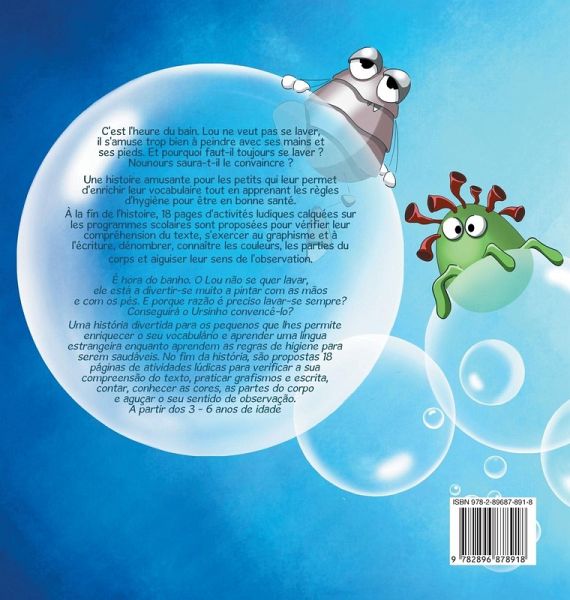 LIVRE BILINGUE FRANÇAIS - PORTUGAIS. Une histoire + un cahier d'activités bilingues en français - portugais. C'est l'heure du bain. Lou ne veut pas se laver, il s'amuse trop bien à peindre avec ses mains et ses pieds. Et pourquoi faut-il toujours se laver ? Nounours saura-t-il le convaincre ? Une histoire amusante pour les petits qui leur permet d'enrichir leur vocabulaire tout en apprenant les règles d'hygiène pour être en bonne santé. À la fin de l'histoire, 18 pages d'activités ludiques calquées sur les programmes scolaires sont proposées pour vérifier leur compréhension du texte, s'exercer au graphisme et à l'écriture, dénombrer, connaître les couleurs, les parties du corps et aiguiser leur sens de l'observation. De 3 à 6 ans. Uma história + um livro de actividades bilingue em francês - português. É hora do banho. O Lou não se quer lavar, ele está a divertir-se muito a pintar com as mãos e com os pés. E porque razão é preciso lavar-se sempre? Conseguirá o Ursinho convencê-lo? Uma história divertida para os pequenos que lhes permite enriquecer o seu vocabulário e aprender uma língua estrangeira enquanto aprendem as regras de higiene para serem saudáveis. No fim da história, são propostas 18 páginas de atividades lúdicas para verificar a sua compreensão do texto, praticar grafismos e escrita, contar, conhecer as cores, as partes do corpo e aguçar o seu sentido de observação. A partir dos 3 - 6 anos de idade