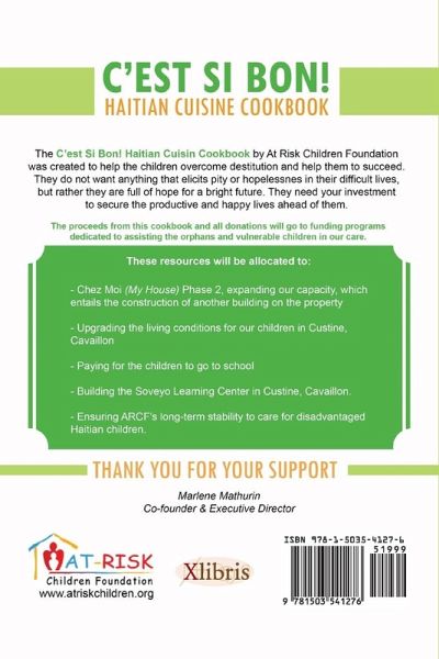 " The C'est Si Bon! Haitian Cuisine Cookbook by At Risk Children Foundation, Inc. was created to help fund programs dedicated to assisting Haiti's vulnerable children and orphans. Haitian cuisine is unique among Caribbean nations and its primary influences include French Creole and African cuisine along with native Taíno and Spanish culinary techniques. C'est Si Bon! Haitian Cuisine Cookbook is a collection of recipes that capture the diverse culinary culture of the region. The book's recipes were contributed by local Haitian restaurant owners, organization members, families, and friends. C'est Si Bon! Haitian Cuisine Cookbook gives readers the opportunity to experience the exciting gastronomic fares of Haiti while contributing to a good cause. The proceeds from this book will be allocated to: - Chez Moi (My House) Phase 2, expanding our capacity, which entails the construction of another building on the property - Upgrading the living conditions for our children in Custine, Cavaillon - Paying for the children to go to school - Building the Soveyo Learning Center in Custine, Cavaillon - Ensuring ARCF's long-term stability to care for disadvantaged Haitian children."