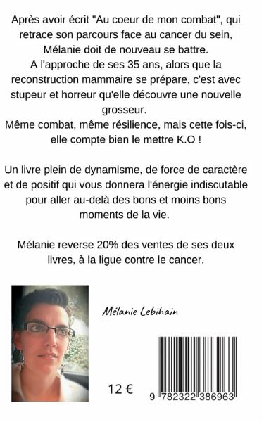 Après avoir écrit "Au coeur de mon combat", qui retrace son parcours face au cancer du sein, Mélanie doit de nouveau se battre. A l'approche de ses 35 ans, alors que la reconstruction mammaire se prépare, c'est avec stupeur et horreur qu'elle découvre une nouvelle grosseur. Même combat, même résilience, mais cette fois-ci, elle compte bien le mettre K.O !Un livre plein de dynamisme, de force de caractère et de positif qui vous donnera l'énergie indiscutable pour aller au-delà des bons et moins bons moments de la vie.Mélanie reverse 20% des ventes de ses deux livres, à la ligue contre le cancer.