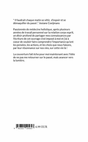 " il faudrait chaque matin, se vêtir d'espoir et se démaquiller du passé ." Josiane CoeijmansPassionnée de médecine holistique, après plusieurs années de travail personnel sur la relation corps esprit, un désir profond de partager mes connaissances par l'écriture de cet ouvrage s'est imposé à moi et j'ai à coeur de vouloir faire comprendre l'importance qu'ont les pensées, les actions, et les choix que nous faisons, par leur résonnance sur nos vies, sur cette vie là !