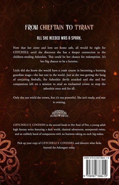 Motivated by love, anger, and ambition, what's the worst that could happen? A prodigal alchemist. Just when Ceychell thought she could enjoy the return of her loved ones, she makes a terrible discovery-she has a deep connection to the child-stealing Ashenkin. No more potions and chores, this is her chance to become the heroine she's always dreamed of being. A prodigious fire mage. Ceychell must undergo a crash course in becoming a burning guardian mage, the last one in the world. But that's just the beginning of her trials. As she and her companions set out to steal an enchanted crown to stop the fiends consuming their world, they soon realize that Ceychell is the only one who can wield the crown. And she wants its power. A tyrant. But the crown is too powerful, and war is coming. Can Ceychell rise to the challenge and save the world from destruction, or will she leave it in ashes? Featuring a dark and thrilling world, classical adventures, unexpected twists, and an unlikely band of companions, Ceychell's Cinders will keep you hooked until the very end. Don't miss out on this heart-pumping, action-packed adventure! Pick up Book 2 of Her Soul of Fire, Ceychell's Cinders today!