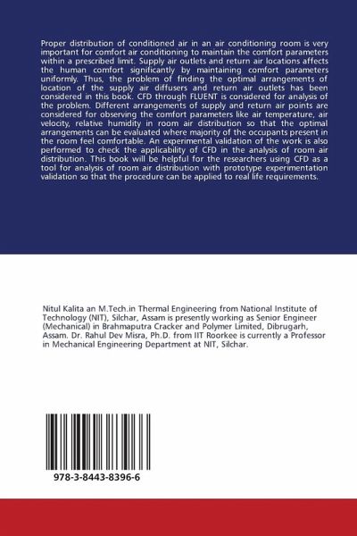Proper distribution of conditioned air in an air conditioning room is very important for comfort air conditioning to maintain the comfort parameters within a prescribed limit. Supply air outlets and return air locations affects the human comfort significantly by maintaining comfort parameters uniformly. Thus, the problem of finding the optimal arrangements of location of the supply air diffusers and return air outlets has been considered in this book. CFD through FLUENT is considered for analysis of the problem. Different arrangements of supply and return air points are considered for observing the comfort parameters like air temperature, air velocity, relative humidity in room air distribution so that the optimal arrangements can be evaluated where majority of the occupants present in the room feel comfortable. An experimental validation of the work is also performed to check the applicability of CFD in the analysis of room air distribution. This book will be helpful for the researchers using CFD as a tool for analysis of room air distribution with prototype experimentation validation so that the procedure can be applied to real life requirements.