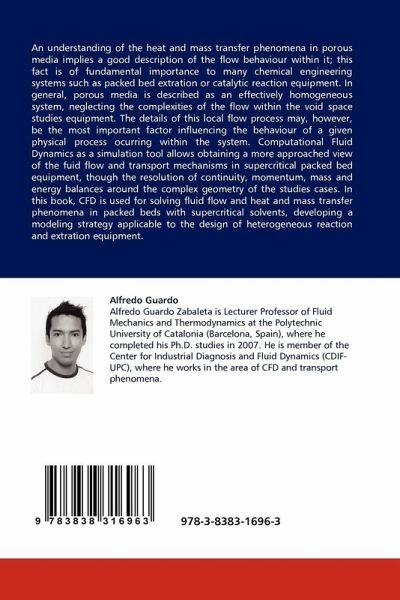 An understanding of the heat and mass transfer phenomena in porous media implies a good description of the flow behaviour within it; this fact is of fundamental importance to many chemical engineering systems such as packed bed extration or catalytic reaction equipment. In general, porous media is described as an effectively homogeneous system, neglecting the complexities of the flow within the void space studies equipment. The details of this local flow process may, however, be the most important factor influencing the behaviour of a given physical process ocurring within the system. Computational Fluid Dynamics as a simulation tool allows obtaining a more approached view of the fuid flow and transport mechanisms in supercritical packed bed equipment, though the resolution of continuity, momentum, mass and energy balances around the complex geometry of the studies cases. In this book, CFD is used for solving fluid flow and heat and mass transfer phenomena in packed beds with supercritical solvents, developing a modeling strategy applicable to the design of heterogeneous reaction and extration equipment.