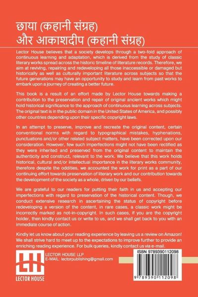 Chaaya (Kahani Sangraha) Aur Aakashdeep (Kahani Sangraha) This book is a result of an effort made by us towards making a contribution to the preservation and repair of original classic literature. In an attempt to preserve, improve and recreate the original content, we have worked towards: 1. Type-setting & Reformatting: The complete work has been re-designed via professional layout, formatting and type-setting tools to re-create the same edition with rich typography, graphics, high quality images, and table elements, giving our readers the feel of holding a 'fresh and newly' reprinted and/or revised edition, as opposed to other scanned & printed (Optical Character Recognition - OCR) reproductions. 2. Correction of imperfections: As the work was re-created from the scratch, therefore, it was vetted to rectify certain conventional norms with regard to typographical mistakes, hyphenations, punctuations, blurred images, missing content/pages, and/or other related subject matters, upon our consideration. Every attempt was made to rectify the imperfections related to omitted constructs in the original edition via other references. However, a few of such imperfections which could not be rectified due to intentional\unintentional omission of content in the original edition, were inherited and preserved from the original work to maintain the authenticity and construct, relevant to the work. We believe that this work holds historical, cultural and/or intellectual importance in the literary works community, therefore despite the oddities, we accounted the work for print as a part of our continuing effort towards preservation of literary work and our contribution towards the development of the society as a whole, driven by our beliefs. We are grateful to our readers for putting their faith in us and accepting our imperfections with regard to preservation of the historical content. HAPPY READING!