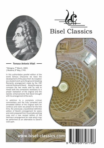 In this authoritative parallel edition of the world famous Chaconne we trace the development of the piece from its inception as a student work up to the ground-breaking Romantic arrangement made by the 19C violinist Ferdinand David. Along the way we compare the two works side by side to reveal both the corrections necessary to a proper realisation of the original and the stylistic enhancements that David brought with his arrangement of the work. In addition to a complete critical commentary and the fully corrected and annotated edition of the original work for continuo and violin we present for the first time, the previously unpublished definitive edition of David's arrangement for piano and violin prepared from his private working copy and a new revised edition of the Hermann arrangement for viola which may be performed as an alternative to David's violin part.