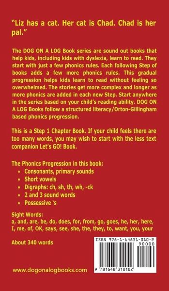 This book has about 340 words. The DOG ON A LOG Book series helps kids, including kids with dyslexia, learn to read. They are sound out books that start with just a few phonics rules. Each following Step of books adds a few more phonics rules and sight words. This gradual progression helps kids learn to read without feeling so overwhelmed. Start anywhere in the series based on your child's reading skills. The word list below will help you decide where in the series your child should start. Printable game boards, flashcards, handwriting sheets, and more are available to for additional practice. Information on the printables is provided in each book. The (purple) Let's GO! books have fewer words for new or less confident readers. The (red) chapter books are longer for more reading practice. Kids enjoy these stories that get more complex and longer as more phonics are added throughout the series. Books can be purchased individually or as collection volumes. This is an individual Step 1 Chapter Book. Additional information on using this series is available in the digital book HOW TO USE DECODABLE BOOKS TO TEACH READING. DOG ON A LOG Books follow an Orton Gillingham/systematic-phonics progression. DOG ON A LOG "What Step Should We Start With?" Word List Have your child read the following words. If they can't read every word in a Step, that is probably the step they should start with. For some kids, you may want to start at an earlier Step so they can build confidence in their reading ability. Step 1 fin, mash, sock, sub, cat, that, Dan's Step 2 less, bats, tell, mall, chips, whiff, falls Step 3 bangs, dank, honk, pings, chunk, sink, gong, rungs Step 4 silk, fluff, smash, krill, drop, slim, whisk Step 5 hunch, crate, rake, tote, inch, mote, lime Step 6 child, molts, fold, hind, jolt, post, colds Step 7 strive, scrape, splint, twists, crunch, prints, blend Step 8 finish, denim, within, bathtub, sunset, medic, habit Step 9 hundred, goldfinch, tree, wheat, inhale, play, Joe Step 10 be, remake, spry, repeat, silo, sometime, pinwheel Step 11 far, north, spire, turn, inhabit, calculate, Wyoming Many early reader books or leveled books are written so they cannot be sounded out. Kids often struggle and grow frustrated when they can't sound out the words. However, kids who have been taught the phonics and sight words in DOG ON A LOG Books can be proud when they are able to sound out and read almost every word. Paper books are optimized for learners with dyslexia. They have cream colored paper, black and white images, and large Verdana font. Research has shown Verdana is one of the most dyslexia-friendly fonts. More DOG ON A LOG Books: DOG ON A LOG Pup Books ---Before the Squiggle Code (Pre-Reading Skills) ---The Squiggle Code (Learning Letters and Words) ---Kids' Squiggles (First Stories) DOG ON A LOG Parent and Teacher Guides ---Teaching a Struggling Reader: One Mom's Experience with Dyslexia ---How to Use Decodable Books to Teach Reading Relevant portions of the DOG ON A LOG Phonics Progression (Scope and Sequence) and the Quick Assessment Tool ("What Step Should We Start With?" Word List) are inside each book. WATCH FOR MORE STEPS AND BOOKS COMING SOON