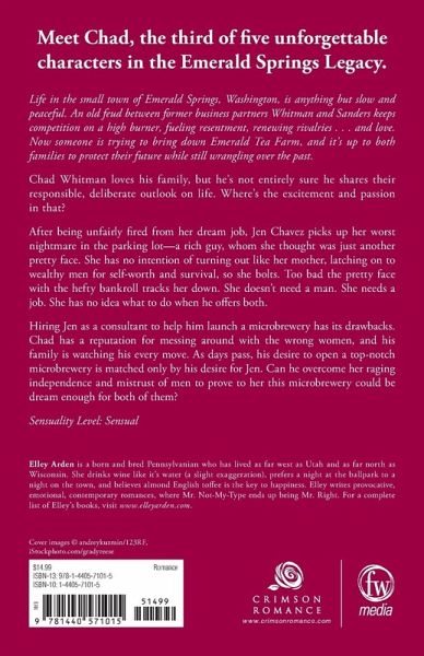 Meet Chad, the third of five unforgettable characters in the Emerald Springs Legacy. Life in the small town of Emerald Springs, Washington, is anything but slow and peaceful. An old feud between former business partners Whitman and Sanders keeps competition on a high burner, fueling resentment, renewing rivalries . . . and love. Now someone is trying to bring down Emerald Tea Farm, and it's up to both families to protect their future while still wrangling over the past. Chad Whitman loves his family, but he's not entirely sure he shares their responsible, deliberate outlook on life. Where's the excitement and passion in that? After being unfairly fired from her dream job, Jen Chavez picks up her worst nightmare in the parking lot - a rich guy, whom she thought was just another pretty face. She has no intention of turning out like her mother, latching on to wealthy men for self-worth and survival, so she bolts. Too bad the pretty face with the hefty bankroll tracks her down. She doesn't need a man. She needs a job. She has no idea what to do when he offers both. Hiring Jen as a consultant to help him launch a microbrewery has its drawbacks. Chad has a reputation for messing around with the wrong women, and his family is watching his every move. As days pass, his desire to open a top-notch microbrewery is matched only by his desire for Jen. Can he overcome her raging independence and mistrust of men to prove to her this microbrewery could be dream enough for both of them? Sensuality Level: Sensual