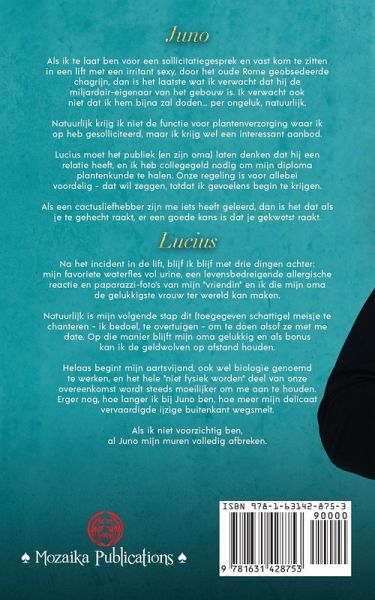 Juno Als ik te laat ben voor een sollicitatiegesprek en vast kom te zitten in een lift met een irritant sexy, door het oude Rome geobsedeerde chagrijn, dan is het laatste wat ik verwacht dat hij de miljardair-eigenaar van het gebouw is. Ik verwacht ook niet dat ik hem bijna zal doden... per ongeluk, natuurlijk. Natuurlijk krijg ik niet de functie voor plantenverzorging waar ik op heb gesolliciteerd, maar ik krijg wel een interessant aanbod. Lucius moet het publiek (en zijn oma) laten denken dat hij een relatie heeft, en ik heb collegegeld nodig om mijn diploma plantenkunde te halen. Onze regeling is voor allebei voordelig - dat wil zeggen, totdat ik gevoelens begin te krijgen. Als een cactusliefhebber zijn me iets heeft geleerd, dan is het dat als je te gehecht raakt, er een goede kans is dat je gekwetst raakt. Lucius Na het incident in de lift, blijf ik blijf met drie dingen achter: mijn favoriete waterfles vol urine, een levensbedreigende allergische reactie en paparazzi-foto's van mijn "vriendin" en ik die mijn oma de gelukkigste vrouw ter wereld kan maken. Natuurlijk is mijn volgende stap dit (toegegeven schattige) meisje te chanteren - ik bedoel, te overtuigen - om te doen alsof ze met me date. Op die manier blijft mijn oma gelukkig en als bonus kan ik de geldwolven op afstand houden. Helaas begint mijn aartsvijand, ook wel biologie genoemd te werken, en het hele "niet fysiek worden" deel van onze overeenkomst wordt steeds moeilijker om me aan te houden. Erger nog, hoe langer ik bij Juno ben, hoe meer mijn delicaat vervaardigde ijzige buitenkant wegsmelt. Als ik niet voorzichtig ben, zal Juno mijn muren volledig afbreken.