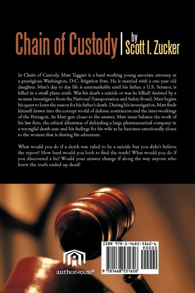 In Chain of Custody, Matt Taggart is a hard working young associate attorney at a prestigious Washington, D.C. litigation firm. He is married with a one year old daughter. Matt's day to day life is unremarkable until his father, a U.S. Senator, is killed in a small plane crash. Was his death a suicide or was he killed? Assisted by a woman investigator from the National Transportation and Safety Bureau, Matt begins his quest to learn the reason for his father's death. During his investigation, Matt finds himself drawn into the corrupt world of defense contractors and the inter-workings of the Pentagon. As Matt gets closer to the answer, Matt must balance the work of his law firm, the ethical dilemmas of defending a large pharmaceutical company in a wrongful death case and his feelings for his wife as he becomes emotionally closer to the woman that is sharing his adventure. Throughout the story the reader is pressed to answer some questions. What would you do if a death was ruled to be a suicide but you didn't believe the report? How hard would you look to find the truth? What would you do if you discovered a lie? Would your answer change if along the way anyone who knew the truth ended up dead?