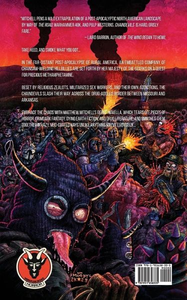 Take heed, and smoke what you got... In the far-distant post-apocalypse of rural America, an embattled company of chainsaw-wielding hillbillies are set forth by Her Majesty of the Ozarks on a quest for precious methamphetamine. Beset by religious zealots, militarized sex workers, and their own addictions, the CHAINDEVILS slash their way across the drug-addled border between Missouri and Arkansas. Embrace the chaos with Matthew Mitchell's debut novella, which tears off pieces of horror, grimdark fantasy, dying earth fiction, and drug literature, and smashes them together in hazy, mud-coated ways unlike anything you've ever seen. "Mitchell pens a wild extrapolation of a post-apocalyptic North American Landscape by way of The Road, Warhammer 40k, and pulp westerns. Chaindevils is hard, grisly fare." - Laird Barron, author of The Wind Began to Howl "Beneath the chainsaws, drugs, and miscreants - Mitchell has created a story about Seachers. Folk that reflect the worst and the best in us, trying to find answers to questions we're too afraid to ask." - Adam Smith (Eisner Award-Nominee, Long Walk to Valhalla) "Gory and raucous weird fiction, Chaindevils is one of the most outrageous stories I've ever read. If you'd like a taste of A Clockwork Orange with a Southern accent, Mad Max on meth, and Blood Meridian with chainsaws, then you'll want to dive into this vivid and original desolation envisioned by Matthew Mitchell." - Ivy Grimes, author of Grime Time "Mitchell gathers the haunted cultural imagination of the Ozarks together with the bloody history of the US's internal border wars and the cultlike stature of their figureheads and squeezes until it all reaches critical mass and burns through the fabric of history into a desolate future. Meth-fueled chainsaw warriors and gilded femdom valkyries and giggling hooded cultists pursue truly shocking violence according to a logic we can only grasp the edge of. Chaindevils festers in the brain like an eldritch hangnail." - Mark Jaskowski, author of Mutant Circuit, The Heartbeat Harvest "It would be a mistake to call this tale a descent into Hell. We're already in Hell from the first page, the first line...No depravity is left unplumbed. No despair left unearned. No doom left unmanifested. You want an army of chainsaw-wielding meth-addicted cannibals? Bizarre masked and horned cultists? Jewel-encrusted monarchist warrior women? It's all here, and more besides. It takes a pure vision and a lot of guts to write something this balls-to-the-wall, and Matthew Mitchell has both. Who knows what new filth-encrusted hells he'll drag us to next, but I'm damn sure going to let him." - Matt Neil Hill, author of short fiction