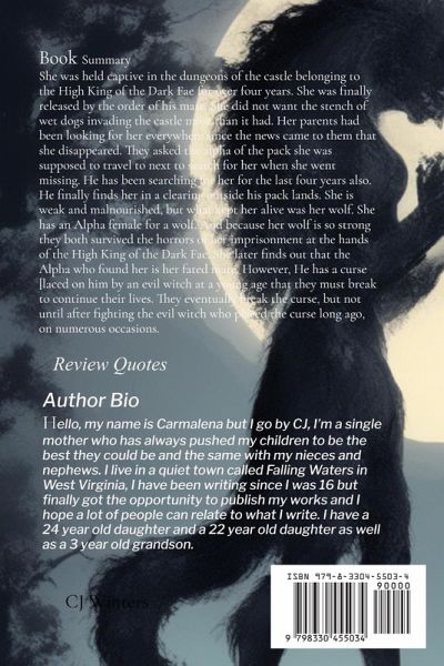 She was held captive in the dungeons of the castle belonging to the High King of the Dark Fae for over four years. She was finally released by the order of his mate. She did not want the stench of wet dogs invading the castle more than it had. Her parents had been looking for her everywhere since the news came to them that she disappeared. They asked the alpha of the pack she was supposed to travel to next to search for her when she went missing. He has been searching for her for the last four years also. He finally finds her in a clearing outside his pack lands. She is weak and malnourished, but what kept her alive was her wolf. She has an Alpha female for a wolf. And because her wolf is so strong they both survived the horrors of her imprisonment at the hands of the High King of the Dark Fae. She later finds out that the Alpha who found her is her fated mate. However, He has a curse [laced on him by an evil witch at a young age that they must break to continue their lives. They eventually break the curse, but not until after fighting the evil witch who placed the curse long ago, on numerous occasions.