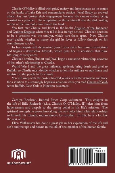 Charlie O'Malley is filled with grief, anxiety and hopelessness as he stands on the banks of Lake Erie and contemplates suicide. Jewel Brady, an avowed atheist has just broken their engagement because she cannot endure being married to a preacher. The temptation to throw himself into the dark, roiling waters of the lake pulls him toward the bank. You first met Charlie and Jewel in the books Anguish of the Innocent and Guilt in Disguise when they fell in love in high school. Charlie's decision to be a preacher was the catalyst, which tore them apart. Now Charlie must decide whether to marry the girl he loves or follow through on his commitment to God. In her despair and depression, Jewel casts aside her moral convictions and begins a destructive lifestyle, which puts her in situations that have life-long consequences. Charlie's brother, Hubert and Jewel begin a romantic relationship, unaware of the other's relationship to Charlie. World War I and the great influenza epidemic bring death and grief to Buffalo, so Charlie must decide whether to join the military or stay home and minister to the people in his church. You will weep with the broken hearted, rejoice with the victorious and hope for a solution to a seemingly hopeless situation when you read Chains of Gold set in Buffalo, New York in Nineteen-seventeen. Carolyn Erickson, Retired Peace Corp volunteer: This chapter in the life of Billy Richards (a.k.a. Charlie Q. O'Malley, II) takes him from hopelessness and despair to the strong belief in his life's mission. The spiritual strength he grows into along the way helps him in his relationships to himself, his friends, and an almost lost brother. In this, he is a lot like the rest of us.
