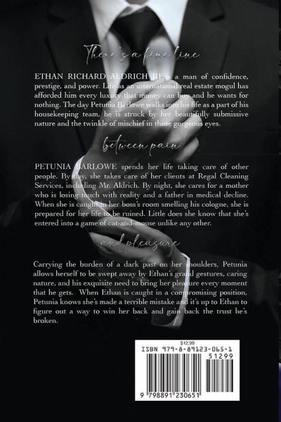 ETHAN RICHARD ALDRICH III is a man of confidence, prestige, and power. Life as an international real estate mogul has afforded him every luxury that money can buy and he wants for nothing. The day Petunia Barlow walks into his life as a part of his housekeeping team, he is struck by her beautifully submissive nature and the twinkle of mischief in those gorgeous eyes. PETUNIA BARLOWE spends her life taking care of other people. By day, she takes care of her clients at Regal Cleaning Services, including Mr. Aldrich. By night, she cares for a mother who is losing touch with reality and a father in medical decline. When she is caught in her boss's room smelling his cologne, she is prepared for her life to be ruined. Little does she know that she's entered into a game of cat-and-mouse unlike any other. Carrying the burden of a dark past on her shoulders, Petunia allows herself to be swept away by Ethan's grand gestures, caring nature, and his exquisite need to bring her pleasure every moment that he gets. When Ethan is caught in a compromising position, Petunia knows she's made a terrible mistake and it's up to Ethan to figure out a way to win her back and gain back the trust he's broken.