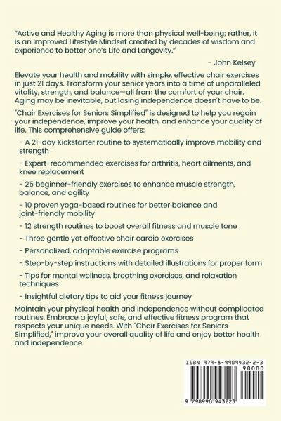 Elevate your Health and Mobility with simple, effective chair exercises in just 21-days, transforming your senior years into a time of unparalleled vitality, strength and balance - all from the comfort of your chair. This All-inclusive book is your gateway to a healthier you, packed with a diverse range of beneficial exercises you can effortlessly perform at home. Here's just a taste of what you'll discover: Expert-recommended exercises that effectively cater to specific health issues such as arthritis, heart ailments, and knee replacements 25 Beginner-friendly chair exercises for improving muscle strength, balance, and agility Boost your cardiovascular health with three chair cardio exercises that are both gentle, and effective Better balance and mobility from 10 proven yoga-based chair routines that are kind-to-your-joints yet very effective A walk-through of 12 strength routines that increase muscle tone and boost overall fitness Improved balance, strength, and mobility aren't about grueling workouts. It's about embracing a joyful, safe, and effective fitness program that respects your unique needs. Your golden years deserve to be packed with vitality, strength, and joy. S why wait? Get it today to start your transformative fitness journey!