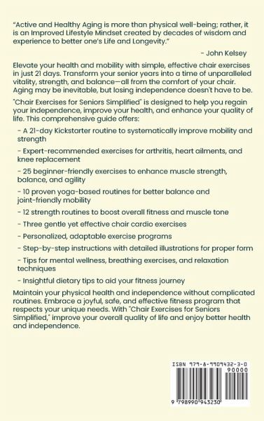 Elevate your Health and Mobility with simple, effective chair exercises in just 21-days, transforming your senior years into a time of unparalleled vitality, strength and balance - all from the comfort of your chair. This All-inclusive book is your gateway to a healthier you, packed with a diverse range of beneficial exercises you can effortlessly perform at home. Here's just a taste of what you'll discover:Expert-recommended exercises that effectively cater to specific health issues such as arthritis, heart ailments, and knee replacements 25 Beginner-friendly chair exercises for improving muscle strength, balance, and agility Boost your cardiovascular health with three chair cardio exercises that are both gentle, and effective Better balance and mobility from 10 proven yoga-based chair routines that are kind-to-your-joints yet very effective A walk-through of 12 strength routines that increase muscle tone and boost overall fitness Improved balance, strength, and mobility aren't about grueling workouts. It's about embracing a joyful, safe, and effective fitness program that respects your unique needs.