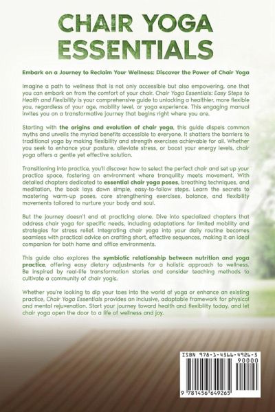 Embark on a Journey to Reclaim Your Wellness: Discover the Power of Chair Yoga Imagine a path to wellness that is not only accessible but also empowering, one that you can embark on from the comfort of your chair. Chair Yoga Essentials: Easy Steps to Health and Flexibility is your comprehensive guide to unlocking a healthier, more flexible you, regardless of your age, mobility level, or yoga experience. This engaging manual invites you on a transformative journey that begins right where you are. Starting with the origins and evolution of chair yoga, this guide dispels common myths and unveils the myriad benefits accessible to everyone. It shatters the barriers to traditional yoga by making flexibility and strength exercises achievable for all. Whether you seek to enhance your posture, alleviate stress, or boost your energy levels, chair yoga offers a gentle yet effective solution. Transitioning into practice, you'll discover how to select the perfect chair and set up your practice space, fostering an environment where tranquility meets movement. With detailed chapters dedicated to essential chair yoga poses, breathing techniques, and meditation, the book lays down simple, easy-to-follow steps. Learn the secrets to mastering warm-up poses, core strengthening exercises, balance, and flexibility movements tailored to nurture your body and soul. But the journey doesn't end at practicing alone. Dive into specialized chapters that address chair yoga for specific needs, including adaptations for limited mobility and strategies for stress relief. Integrating chair yoga into your daily routine becomes seamless with practical advice on crafting short, effective sequences, making it an ideal companion for both home and office environments. This guide also explores the symbiotic relationship between nutrition and yoga practice, offering easy dietary adjustments for a holistic approach to wellness. Be inspired by real-life transformation stories and consider teaching methods to cultivate a community of chair yogis. Whether you're looking to dip your toes into the world of yoga or enhance an existing practice, Chair Yoga Essentials provides an inclusive, adaptable framework for physical and mental rejuvenation. Start your journey toward health and flexibility today, and let chair yoga open the door to a life of wellness and joy.