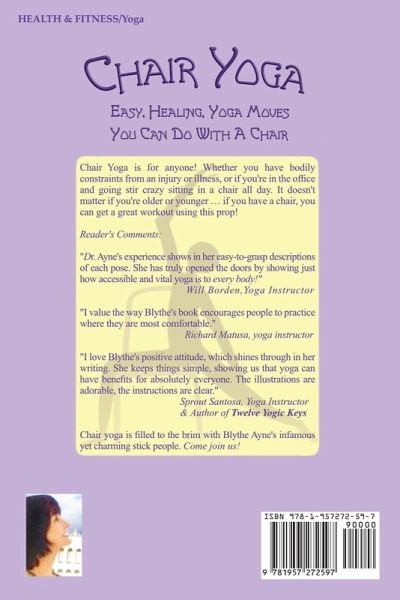 Chair Yoga -Easy, Healing Yoga Moves You Can Do with a Chair Chair Yoga is for anyone! Whether you have bodily constraints from an injury or illness, or if you're in the office and going stir crazy sitting in a chair all day. It doesn't matter if you're older or younger ... if you have a chair, you can get a great workout using this prop! Chair yoga is filled to the brim with Blythe Ayne's infamous yet charming stick people. Come join us!