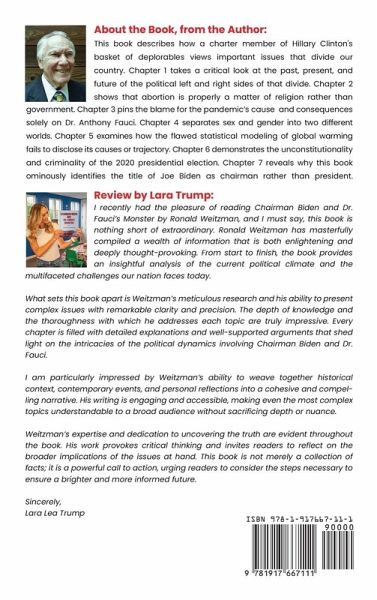 This book describes how a charter member of Hillary Clinton's basket of deplorable views important issues that divide our country. Chapter 1 takes a critical look at the past, present, and future of the political left and right sides of that divide. Chapter 2 shows that abortion is properly a matter of religion rather than government. Chapter 3 pins the blame for the pandemic's cause and consequences solely on Dr. Anthony Fauci. Chapter 4 separates sex and gender into two different worlds. Chapter 5 examines how the flawed statistical modeling of global warming fails to disclose its causes or…mehr