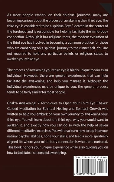 The Third Eye Chakra is considered to be a spiritual "eye" located in the center of the forehead and is responsible for helping facilitate the mind-body connection. Although it has religious roots, the modern evolution of the third eye has involved in becoming a common practice for those who are embarking on a spiritual journey to their inner self. You are not required to hold any particular beliefs or religious status to awaken your third eye... The process of awakening your third eye is highly unique to you as an individual. However, there are general experiences that can help facilitate the awakening and help you manage it. Although the individual experiences may be unique to you, the general process tends to be fairly similar for most people... Chakra Awakening was written to help you embark on your own journey to awakening your third eye. You will learn about the third eye, why you would want to awaken it, and exactly how you can do so with the help of seven different meditative exercises. You will also learn how to tap into your natural psychic abilities, hone your skills, and lead a more spiritually aligned life where your mind-body connection is whole and nurtured. This book honors your unique experience while also guiding you on how to facilitate a successful awakening of your third eye... In this book you'll learn: What is Chakra Healing? What is your Third Eye? How to Open and Activate your Third Eye Meditations for The Third Eye Chakra Balancing the Chakra Forces Spiritual Connections Healing your Third Eye How to Increase your Clairvoyant Power Psychic Awareness Mistakes to Avoid Divine Presence And so much more! This book will change your life and free yourself from negative energies. NOW is the time to make a change and live a happier life! Grab your copy of Chakra Awakening now!