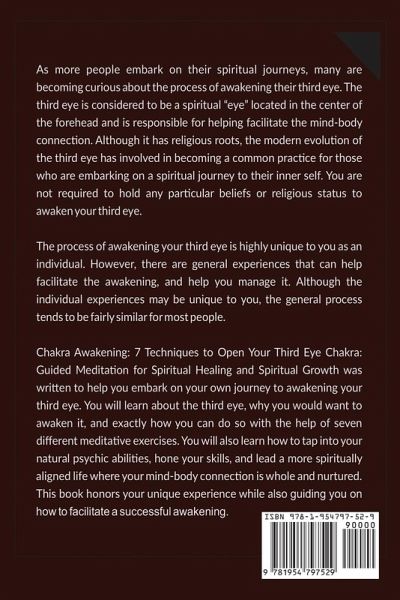 The Third Eye Chakra is considered to be a spiritual "eye" located in the center of the forehead and is responsible for helping facilitate the mind-body connection. Although it has religious roots, the modern evolution of the third eye has involved in becoming a common practice for those who are embarking on a spiritual journey to their inner self. You are not required to hold any particular beliefs or religious status to awaken your third eye... The process of awakening your third eye is highly unique to you as an individual. However, there are general experiences that can help facilitate the awakening and help you manage it. Although the individual experiences may be unique to you, the general process tends to be fairly similar for most people... Chakra Awakening was written to help you embark on your own journey to awakening your third eye. You will learn about the third eye, why you would want to awaken it, and exactly how you can do so with the help of seven different meditative exercises. You will also learn how to tap into your natural psychic abilities, hone your skills, and lead a more spiritually aligned life where your mind-body connection is whole and nurtured. This book honors your unique experience while also guiding you on how to facilitate a successful awakening of your third eye... In this book you'll learn: What is Chakra Healing? What is your Third Eye? How to Open and Activate your Third Eye Meditations for The Third Eye Chakra Balancing the Chakra Forces Spiritual Connections Healing your Third Eye How to Increase your Clairvoyant Power Psychic Awareness Mistakes to Avoid Divine Presence And so much more! This book will change your life and free yourself from negative energies. NOW is the time to make a change and live a happier life! Grab your copy of Chakra Awakening now!