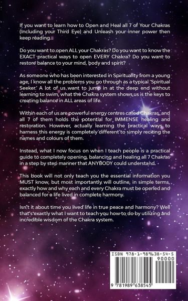 If you want to learn how to Open and Heal all 7 of Your Chakras (Including your Third Eye) and Unleash your inner power then keep reading... Do you want to open ALL your Chakras? Do you want to know the EXACT practical ways to open EVERY Chakra? Do you want to restore balance to your mind, body and spirit? As someone who has been interested in Spirituality from a young age, I know all the problems you go through as a typical ‘Spiritual Seeker.’ A lot of us want to jump in at the deep end without learning to swim, what the Chakra system shows us is the keys to creating balance in ALL areas of life. Within each of us are powerful energy centres called Chakras, and all 7 of them holds the potential for IMMENSE healing and restoration. However, actually learning the practical ways to harness this energy is completely different to simply reciting the names and colours of them. Instead, what I now focus on when I teach people is a practical guide to completely opening, balancing and healing all 7 Chakras in a step by step manner that ANYBODY could understand. This book will not only teach you the essential information you MUST know, but most importantly will outline, in simple terms, exactly how and why each and every Chakra must be opened and balanced for a life lived in complete harmony. Isn’t it about time you lived life in true peace and harmony? Well that’s exactly what I want to teach you how to do by utilizing and incredible wisdom of the Chakra system. Here is just a slither of what you will discover inside... The EXACT exercises to help you open EVERY Chakra in a step by step manner 5 Must know tips for opening your Third Eye 7 Essential Meditation techniques for opening your Chakras The truth about crystals and opening your Chakras One secret, used by ancient Yogis, to help you finally open your crown Chakra The startling ways to SKYROCKET your creativity by utilizing these 3 methods Why you NEED to open all 7 Chakras and not just focus on 2/3 that you feel will give you the most results How to heal your Root Chakra in less time than you believed possible How to dramatically increase your Empathy in all areas of life The Amazing ways to transcend duality and see exactly what your True Nature really is (Hint: IT’s not you think) The 5 most common Chakra myths busted How to pinpoint exactly what ‘Chakra Blockages’ you are facing and the crucial techniques to properly healing them How your addictions could be due to an unbalanced Chakra Why 99% of us still NEED to heal multiple Chakras Introducing how to heal ‘Overactive’ Chakras (Not many people mention this) Proven strategies for healing EVERY ailment you face using effective Chakra healing techniques And, that is hardly even scratching the surface! Even if you have no idea what the 3rd eye is or NEVER heard of the Chakras before, this book will outline in a step by step manner how you can open, heal and balance all 7 of your Chakras using EASY to learn techniques! (Instead of learning pointless theory that doesn’t help you in your own life!) So, if you’re ready to learn the proven and most effective techniques for opening and healing all 7 Chakras and living a life full of peace and happiness then scroll up and click "add to cart."
