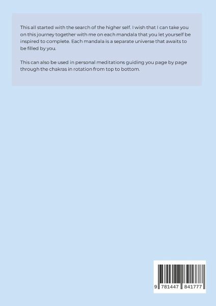 This all started with the search of the higher self. I wish that I can take you on this journey together with me on each mandala that you let yourself be inspired to complete. Each mandala is a separate universe that awaits to be filled by you. This can also be used in personal meditations guiding you page by page through the chakras in rotation from top to bottom.