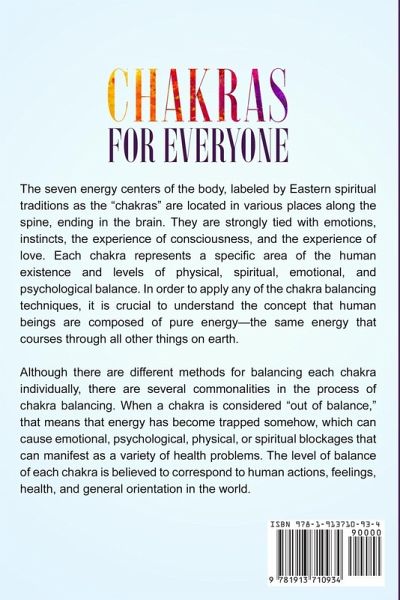 The seven energy centers of the body, labeled by Eastern spiritual traditions as the "chakras" are located in various places along the spine, ending in the brain. They are strongly tied with emotions, instincts, the experience of consciousness, and the experience of love. Each chakra represents a specific area of the human existence and levels of physical, spiritual, emotional, and psychological balance. In order to apply any of the chakra balancing techniques, it is crucial to understand the concept that human beings are composed of pure energy-the same energy that courses through all other things on earth. In Chakras For Everyone You Will Learn: ¿ Essentials of the Seven Chakras ¿ Crown Chakra ¿ Throat Chakra ¿ Heart Chakra ¿ Energy Healing- The Key to Holistic Health ¿ Energy Healing and Overcoming Suffering¿ Third Eye Chakra ¿ Solar Plexus Chakra ¿ Sacral Chakra ¿ Root Chakra ¿ How To Bring Yourself into Balance ¿ Crystals and Corresponding Chakras ¿ Plants, Herbs, Oils, and Corresponding Chakras ¿ Chakra Balancing Activities ¿ Chakra Check-In And Much More! Although there are different methods for balancing each chakra individually, there are several commonalities in the process of chakra balancing. When a chakra is considered "out of balance," that means that energy has become trapped somehow, which can cause emotional, psychological, physical, or spiritual blockages that can manifest as a variety of health problems. The level of balance of each chakra is believed to correspond to human actions, feelings, health, and general orientation in the world. Pick up your copy of the book right now by clicking the BUY NOW button at the top of this page!