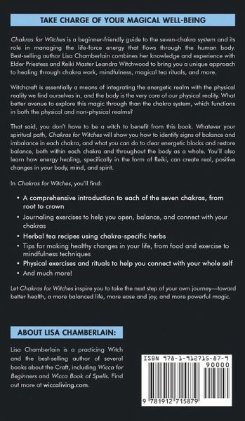 Take Charge of Your Magical Well-Being Chakras for Witches is a beginner-friendly guide to the seven-chakra system and its role in managing the life-force energy that flows through the human body. Best-selling author Lisa Chamberlain combines her knowledge and experience with Elder Priestess and Reiki Master Leandra Witchwood to bring you a unique approach to healing through chakra work, mindfulness, magical tea rituals, and more. Witchcraft is essentially a means of integrating the energetic realm with the physical reality we find ourselves in, and the body is the very core of our physical reality. What better avenue to explore this magic through than the chakra system, which functions in both the physical and non-physical realms? That said, you don't have to be a witch to benefit from this book. Whatever your spiritual path, Chakras for Witches will show you how to identify signs of balance and imbalance in each chakra, and what you can do to clear energetic blocks and restore balance, both within each chakra and throughout the body as a whole. You'll also learn how energy healing, specifically in the form of Reiki, can create real, positive changes in your body, mind, and spirit. In Chakras for Witches, you'll find: A comprehensive introduction to each of the seven chakras, from root to crown Journaling exercises to help you open, balance, and connect with your chakras Herbal tea recipes using chakra-specific herbs Tips for making healthy changes in your life, from food and exercise to mindfulness techniques Physical exercises and rituals to help you connect with your whole self And much more! Let Chakras for Witches inspire you to take the next step of your own journey-toward better health, a more balanced life, more ease and joy, and more powerful magic. If you're ready to start healing and living your best magical life, just scroll to the top of the page and hit the Buy button!