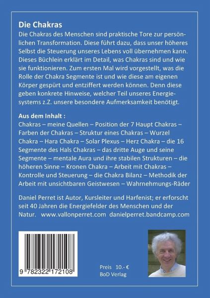 ChakrasDie Chakras des Menschen sind praktische Tore zur persönlichen Transformation. Diese führt dazu, dass unser höheres Selbst die Steuerung unseres Lebens voll übernehmen kann. Dieses Büchlein erklärt im Detail, was Chakras sind und wie sie funktionieren. Zum ersten Mal wird vorgestellt, was die Rolle der Chakra Segmente ist und wie diese am eigenen Körper gespürt und entziffert werden können. Denn diese geben konkrete Hinweise, welcher Teil unseres Energiesystems z.Z. unsere besondere Aufmerksamkeit benötigt.Aus dem InhaltChakras ; meine Quellen ; Position der 7 Haupt Chakras ; Farben der Chakras ; Struktur eines Chakras ; Wurzel Chakra ; Hara Chakra ; Solar Plexus ; Herz Chakra ; die 16 Segmente des Hals Chakras ; das dritte Auge und seine Segmente ; mentale Aura und ihre stabilen Strukturen ; die höheren Sinne ; Kronen Chakra ; Arbeit mit Chakras ; Kontrolle und Steuerung ; die Chakra Bilanz ; Methodik der Arbeit mit unsichtbaren Geistwesen ; Wahrnehmungs-Räder