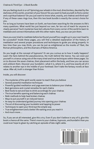 This is a compilation book of: ·Chakras: For Beginners - How to Awaken and Balance Your Chakras and Heal Yourself with Chakra Healing, Reiki Healing and Guided Meditation ·Third Eye: Simple Techniques to Awaken Your Third Eye Chakra With Guided Meditation, Kundalini, and Hypnosis (psychic abilities, spiritual enlightenment) Are you feeling stuck in a rut? Spinning your wheels in the mud, directionless, daunted by the darkness of this world, uncertain of your future?Do you want to heal yourself, to find a center and a spiritual balance? Do you just want to know what, exactly, are chakras and third eye? If any of these cases rings true, then this two book bundle is exactly the correct choice for you. For as long as humans have been on Earth, we have been searching for the answers to life's many questions. What world lies just beyond our own, far too out of reach for anyone to clearly perceive? Such mysteries have led cultures from every corner of the world to learn to meditate and connect themselves with this other realm. Now, you too can join them. Have you ever tried to meditate before but found yourself too caught up in your own head to be successful? Inside these pages, you will find a detailed explanation of the history of meditation and several proper procedures and techniques to guide you along properly. In less time than you may think, you can be just as enlightened as the monks of Tibet, the Roman philosophers, and the shamans of Native America. Do you laugh at the concept of hypnosis? Or are you curious as to how it really happens? Learn the facts behind the pseudoscience, the truth behind the trance. You can even put yourself in a trance using one of the many tried-and-true techniques within these pages. Go on to discover the seven chakras, their placement within the body, and how you can access and unblock them. Discover your kundalini-what it is, where it is, and how exactly all of it relates to another eye in the middle of your forehead. Don't take the fantasy novels at face value. After all, truth is stranger than fiction. Inside, you will discover: The mysteries of the spirit world, easier to reach than you believe Several powerful meditation techniques Powerful guided meditation and yoga exercises to balance your chakras Best gemstone and crystal remedies for each chakra Best foods to eat and teas to drink accordingly for your chakras The true benefits opening and balancing each chakras Reiki methods to help heal broken chakras Ways to put yourself in an induced trance An easy-to-understand guided journey into opening your chakras The art of discovering your kundalini and tapping its power Techniques to open your third eye the simple way True enlightenment and a better life waiting once you reach it And much more… So, if you are at all interested, give this a try. Even if you don't believe in any of it, give this book a chance all the same. There's more to your chakras, hypnosis, and kundalini than you could ever hope to glean by catching an episode of late-night cable. Click "Add to Cart" now, and take your first step