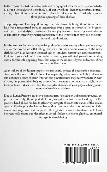 In the course of Chakras, individuals will be equipped with the necessary knowledge to attune themselves to their body's inherent wisdom, thereby identifying impediments, disruptions, and unforeseen obstacles that can be effortlessly resolved through the opening of their chakras. The principles of Tantric philosophy, in which chakras hold significant importance, have been transmitted through generations over a span of centuries. Its doctrines rest upon the underlying conviction that our physical constitutions possess inherent capabilities to effectively manage a majority of the stressors that may lead to disruptions and complications. It is imperative for you to acknowledge that the sole means by which you can progress in the process of self-healing involves acquiring comprehension of the seven chakras, as well as learning the methods to stimulate, harmonize, and restore equilibrium to your chakras. In alternative scenarios, you will find yourself contending with a formidable opposing force that negates the impact of your endeavors, if not entirely nullifies them. As members of the human species, we frequently possess the perception that medicine holds the key to all solutions. Consequently, when medicine fails to diagnose our ailments, a sense of disorientation and powerlessness may overwhelm us. Nevertheless, the potential underlying cause of your current emotional state might be attributed to an imbalance within the energetic channels of your physical being, commonly referred to as chakras. Due to Lynda Frazier's extensive commitment to studying and gaining practical experience over a significant period of time, her guidance in Chakra Healing: The Beginner's Lead allows readers to effectively navigate the intricate nature of the chakra system. Frazier provides her readers with a comprehensive comprehension of this groundbreaking therapeutic approach through elucidating the fundamental linkages between each chakra and the effect that each chakra has on our physical, emotional, and spiritual well-being.